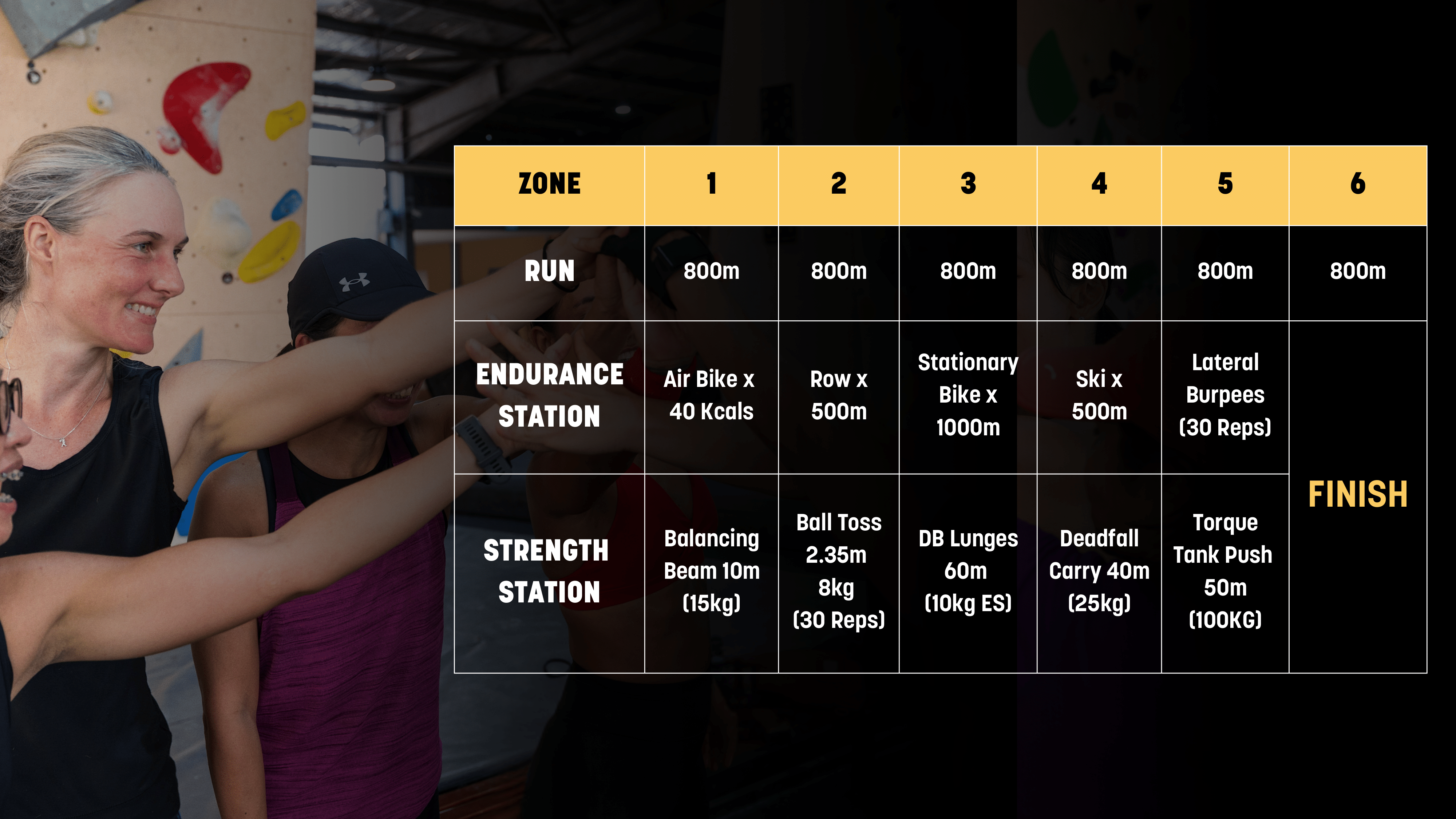 each zone, there is an endurance station folowed by a strength or obstacle station, both of which must be